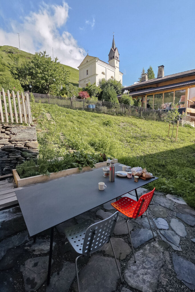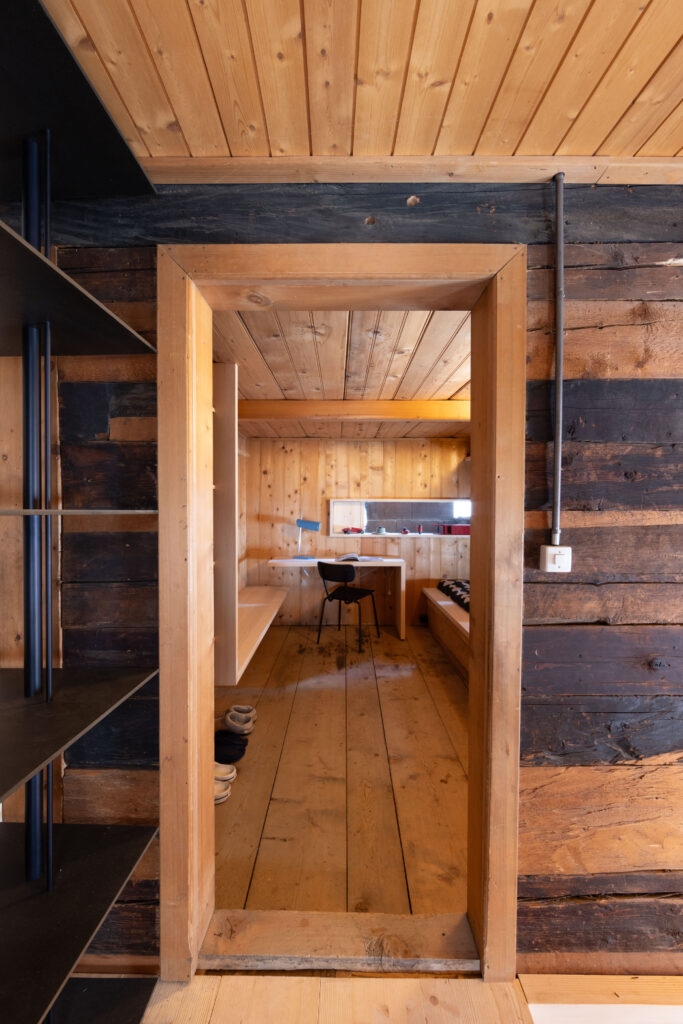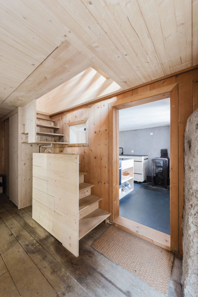 Die niedrigen historischen Türen wurden erhalten, sie verlangen etwas Achtsamkeit, wie auch die tiefen Brüstungen an Fenstern und Geländern. Danke für ihre diesbezügliche Vorsicht. Wo immer möglich wurde vorhandenes Baumaterial wiederverwendet. Die modernen schlichten Möbel stammen aus unserer Familienwerkstatt: www.sanktjohanser.net Die Haushälfte liegt auf der Ostseite, dem ortsbildprägenden Rundholzstall zugewandt und bildet nun mit ihm einen geschützten Platz mit Terrasse, Tisch und Sitzbank.