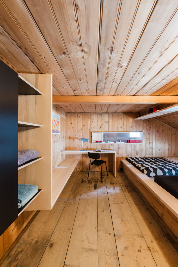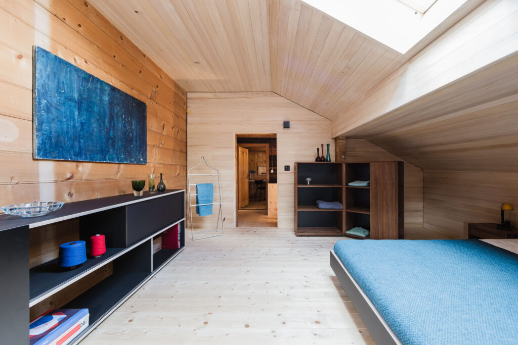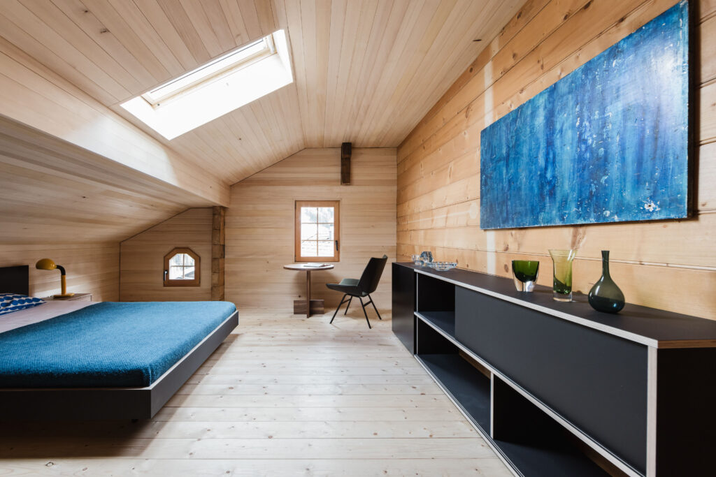 Ein großes helles Dachzimmer mit Doppelbett, Sideboard, Kofferschrank, Tisch und Sessel. Das kleine Dachzimmer daneben weist neben Tisch und Bank ein Stauraummöbel auf; ein geräumiges Podestbett mit zwei breiten Matratzen (120, 150 cm) bietet weitere Schlafplätze. Auch hier sind die historischen Täfer erhalten.